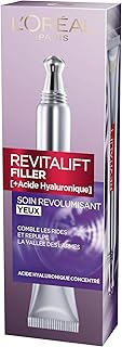 the l'oréal paris revitalift filler 2.5% hyaluronic acid + caffeine eye serum has been validated with dermatologists, eyes look 5 years younger in just 2 weeks.* *equivalence in years of appearance improvement of crows feet, wrinkles & under eyes lines. 81 women cosmeto-clinical scorage after 2 weeks of using the revitalift filler 2.5%. This item L Oreal Paris Hyaluronic Acid Serum Revitalift Filler [+Hyaluronic Acid], 1.5% Pure Concentrated Hyaluronic Acid Dropper Serum L'Oreal Paris 1.5% Pure Hyaluronic Acid Serum for Face with Vitamin C from Revitalift Derm Intensives for Dewy Looking Skin, Hydrate, Moisturize, Plump Skin, Reduce Wrinkles, Anti Aging Serum, 1 Oz